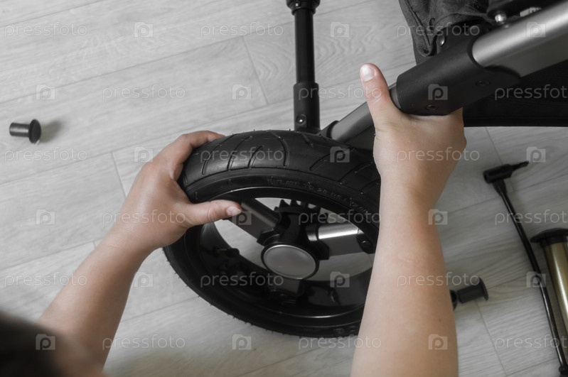 Женщина устанавливает колесо на новую детскую коляску. Процесс сборки коляски для новорожденного. Колесо тележки в сборе. Выборочный фокус