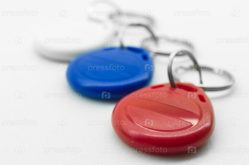Ключевой крючок с RFID-меткой. Пластмассовый клонированный бесконтактный электронный радиоключ для домашнего телефона. NFC-метка. Цвета российского флага. Выборочный фокус