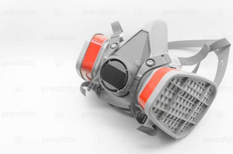 Респиратор. Противогаз. Фильтрующая маска для защиты органов дыхания от пыли и загрязненного воздуха. Защитная рабочая одежда. Избирательный фокус, изолированный на белом
