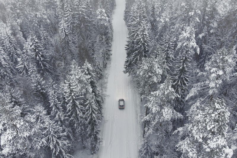 Автомобиль едет по заснеженной дороге в зимнем сказочном лесу. Воздушный вид. Тематика автотранспорта и путешествий