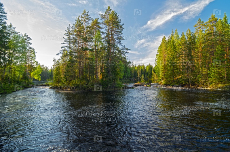 Небольшой островок, поросший сосновым лесом. Река Южная Шуя, Карелия. Солнечный день в июне
