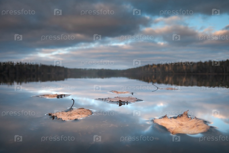 Опавшие листья на поверхности лесного озера. Сосредоточьтесь на переднем плане
