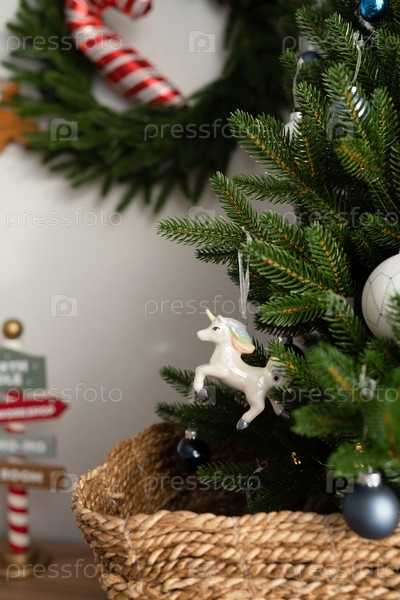 Игрушка на елку висит на ветке, единорог из керамики