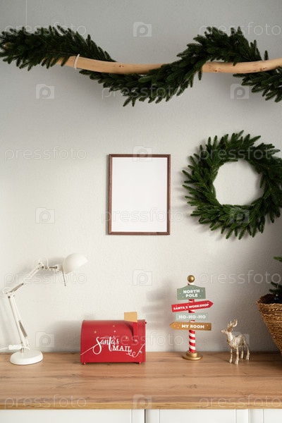 Макет деревянной рамы в интерьере комнаты, украшенной к Рождеству