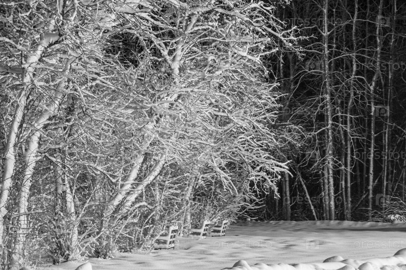Зимний ночной пейзаж - деревья в снегу и сияющие уличные фонари. Красочная ночная сцена с деревьями в инее в морозную погоду