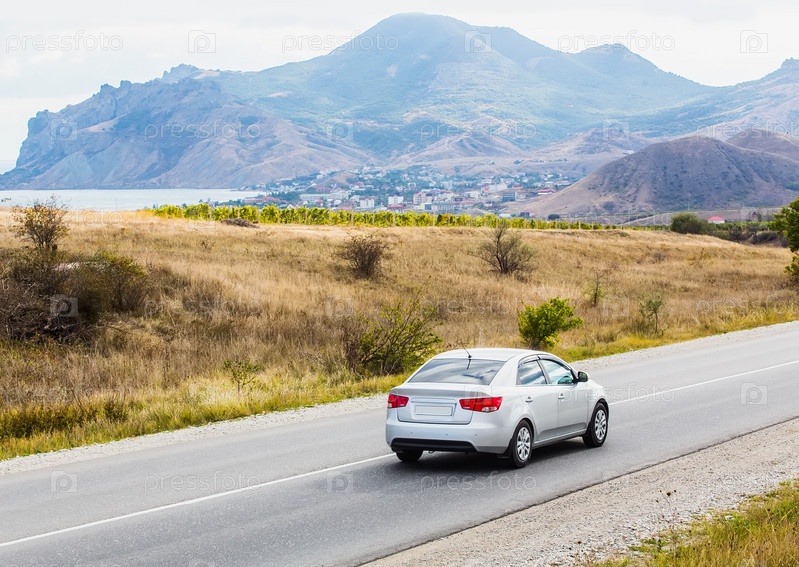 Пейзаж с горами, озером, дорогой и автомобилем