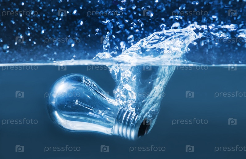 Электрическая лампочка в брызгах воды