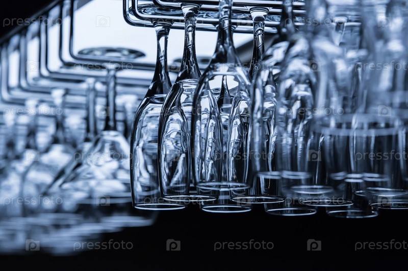 Чистые блестящие бокалы и кубки висят на барной стойке