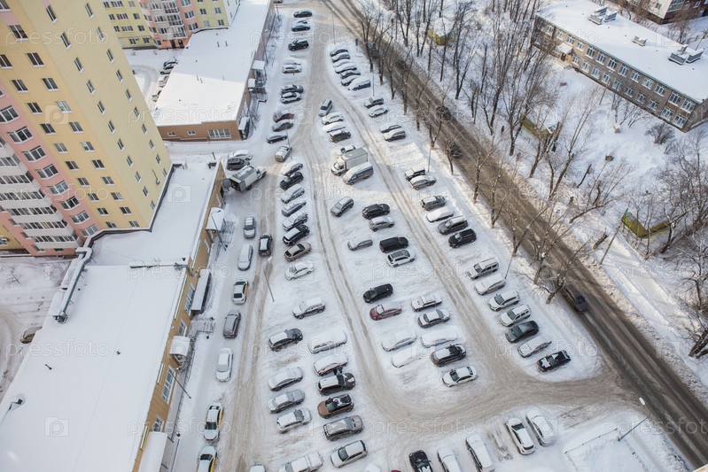 Автомобили на стоянке зимой в городе