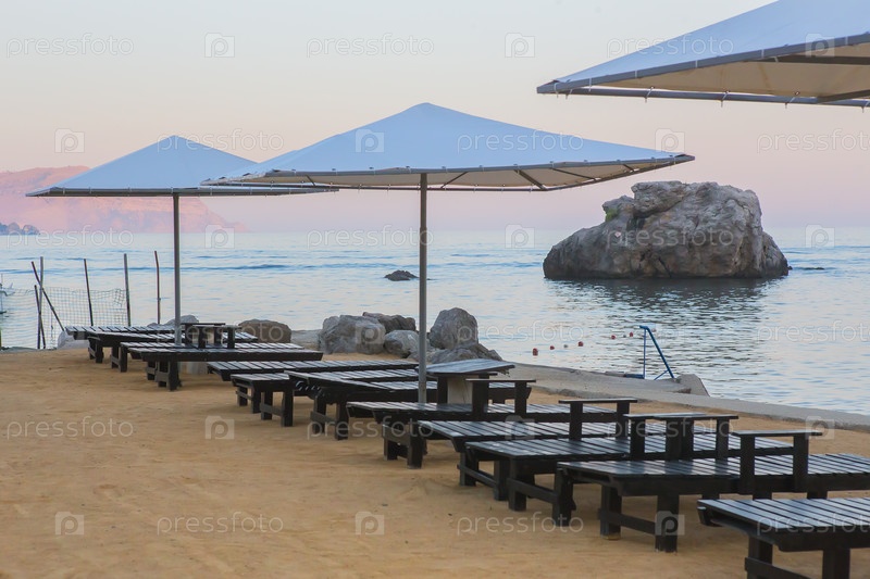 Пляж у моря с шезлонгами и зонтиками утром на рассвете