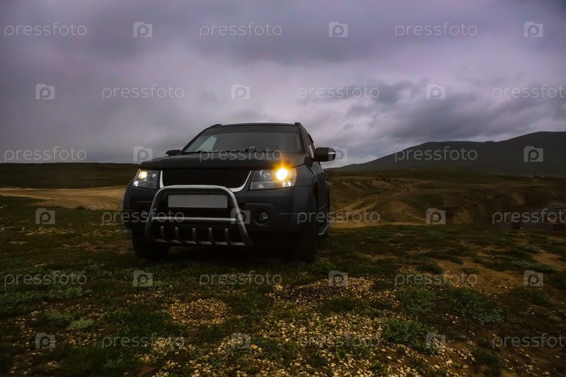 Внедорожник на поле под пасмурным небом
