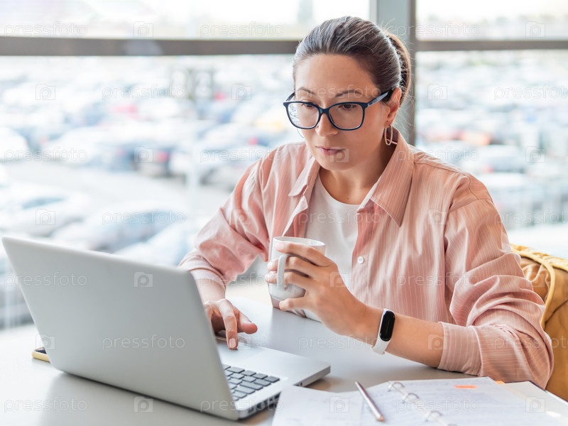 Женщина в очках работает с ноутбуком. Современный офис с панорамными окнами в коворкинг-центре. Рабочее место для фрилансеров в бизнес-центре