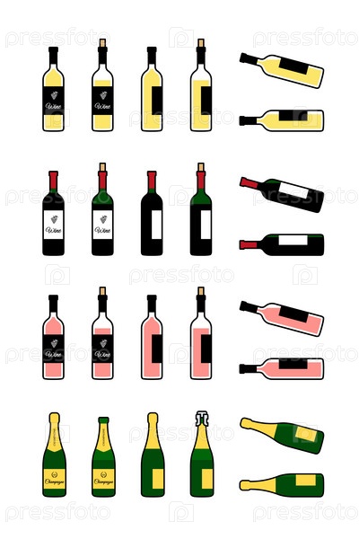 Набор иконок бутылки вина и шампанского. Бутылка полная, открытая, лежа на боку