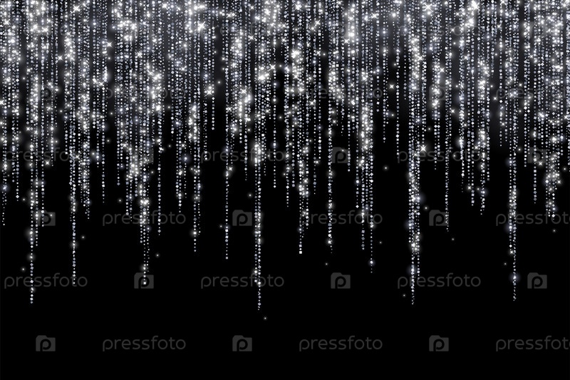 Серебряное праздничное украшение с длинной блестящей гирляндой на черном фоне
