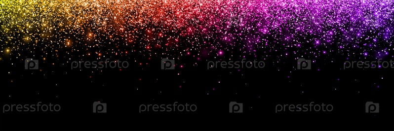 Широкие многоцветные желтые красные розовые фиолетовые падающие частицы со светящимися огнями на черном фоне