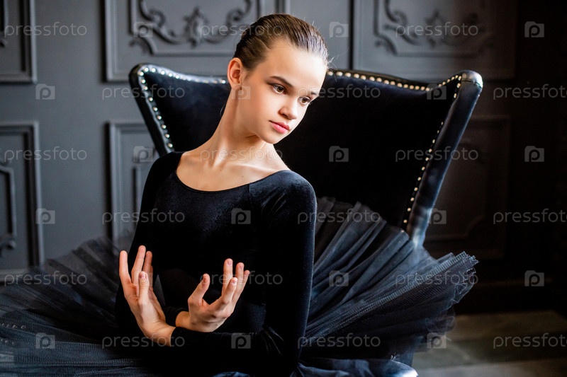 Портрет молодой балерины в черной пачке на темном фоне