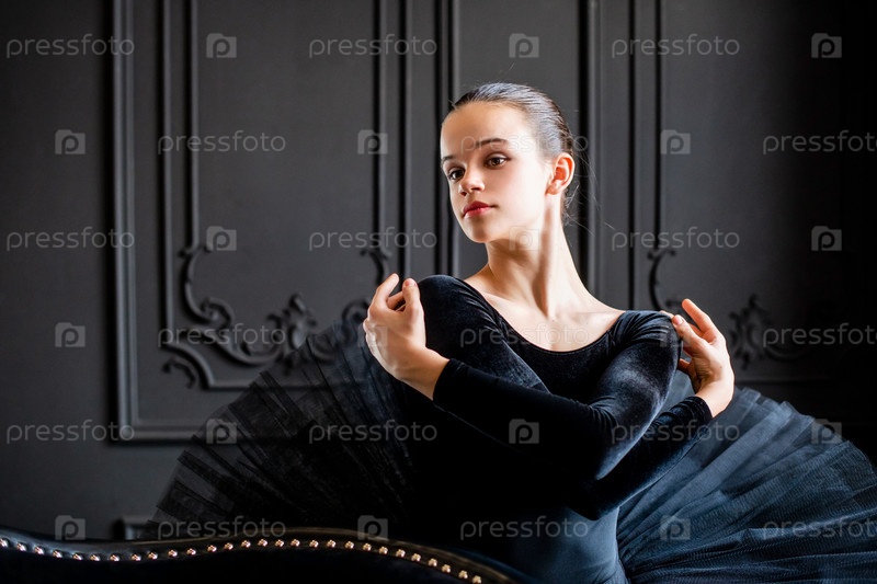 Портрет молодой балерины в черной пачке на темном фоне