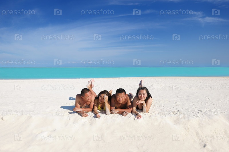 Группа счастливых молодых людей отдыхают на пляже