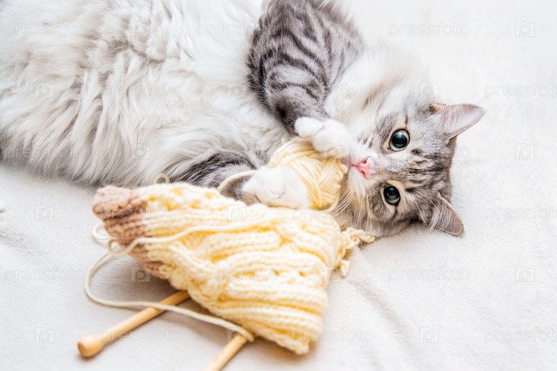 Пушистый милый серый кот весело играет с шариками из пряжи, царапая задними лапами, лежащими на спине