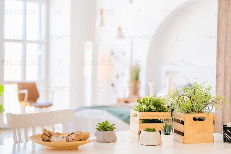 Комнатные растения в декоративных коробках на фоне современного чистого интерьера, место для вашего текста