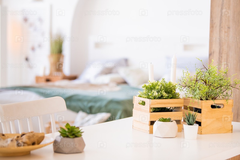 Комнатные растения в декоративных коробках на фоне современного чистого интерьера, место для вашего текста