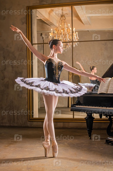 Молодая балерина в белой пачке танцует на красивом старом рояле в винтажном интерьере