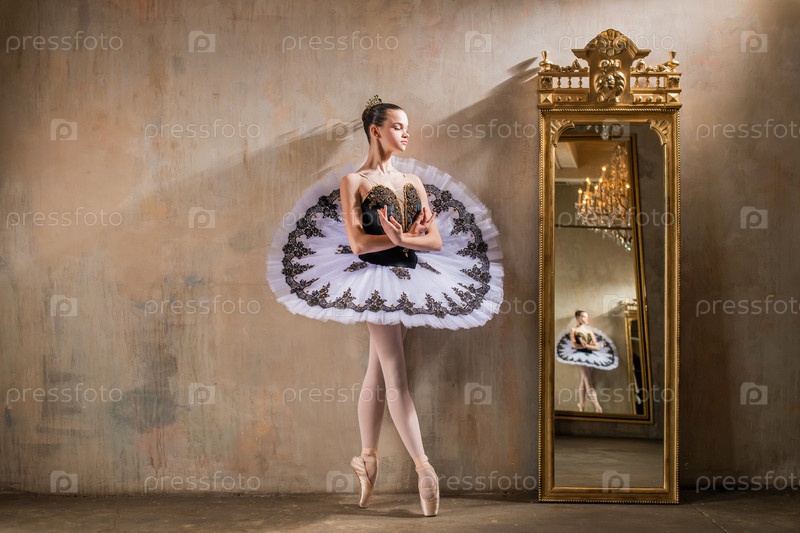 Юная балерина в белой пачке позирует рядом с красивым старым ряженым в винтажном интерьере, много раз размышляя