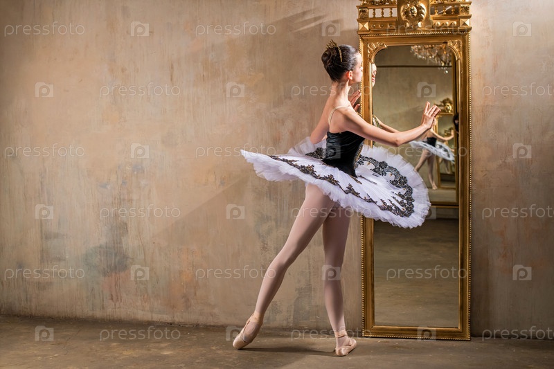 Юная балерина в белой пачке позирует рядом с красивым старым ряженым в винтажном интерьере, много раз размышляя