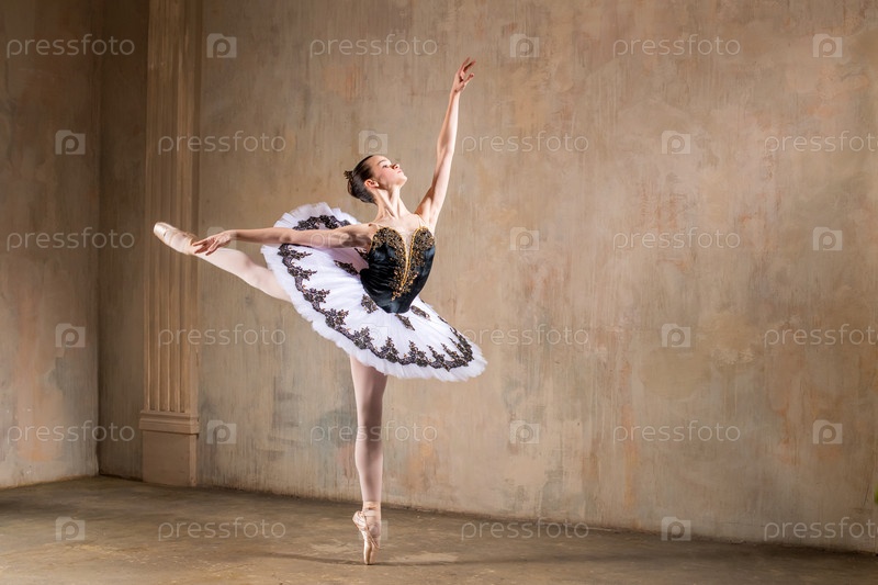 Молодая балерина в белой пачке танцует в центре внимания на винтажной сцене