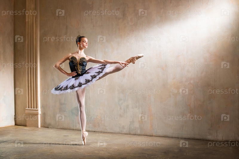 Молодая балерина в белой пачке танцует в центре внимания на винтажной сцене