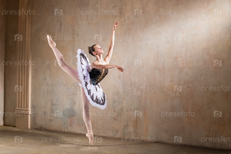 Молодая балерина в белой пачке танцует в центре внимания на винтажной сцене