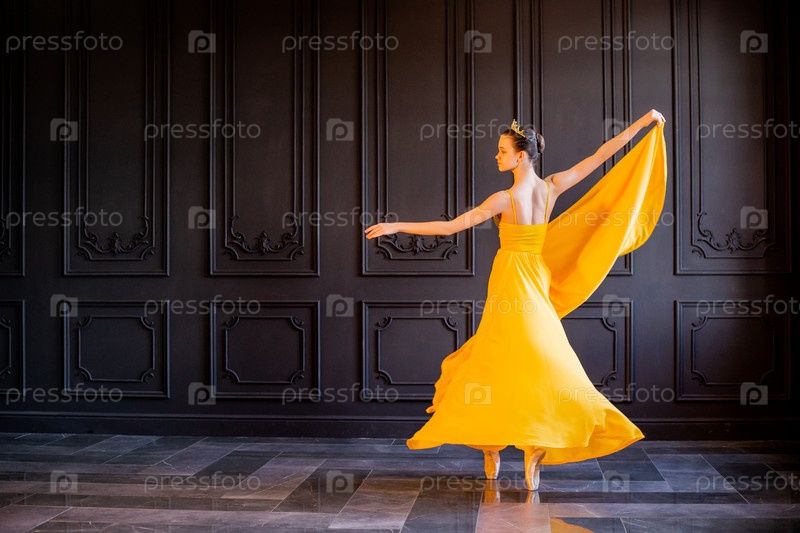Элегантная балерина в пуантах танцует с развевающейся желтой тканью на темно-сером фоне