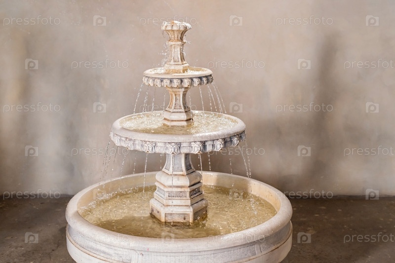 Старинный каменный многоярусный фонтан с льющейся водой в интерьере