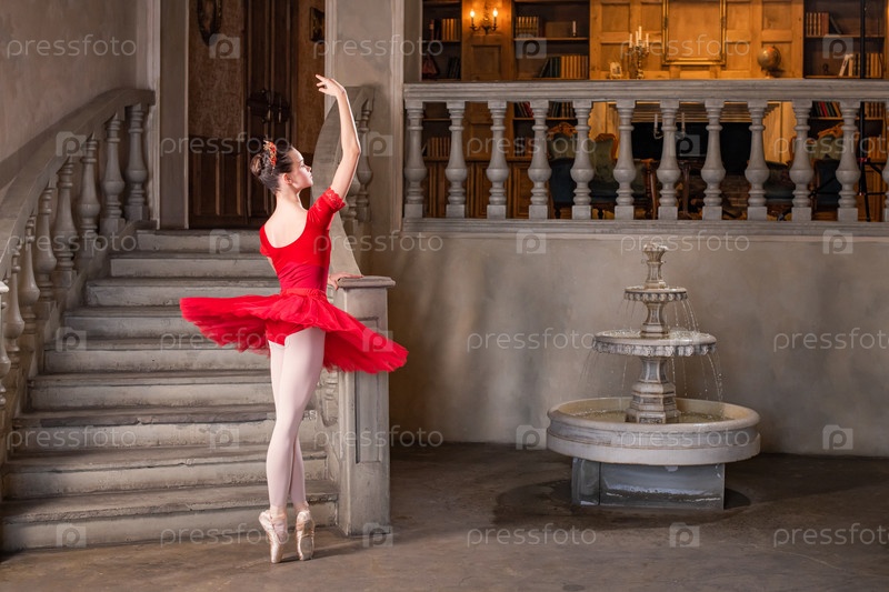 Юная балерина в красной пачке танцует на фоне театральных декораций дворца