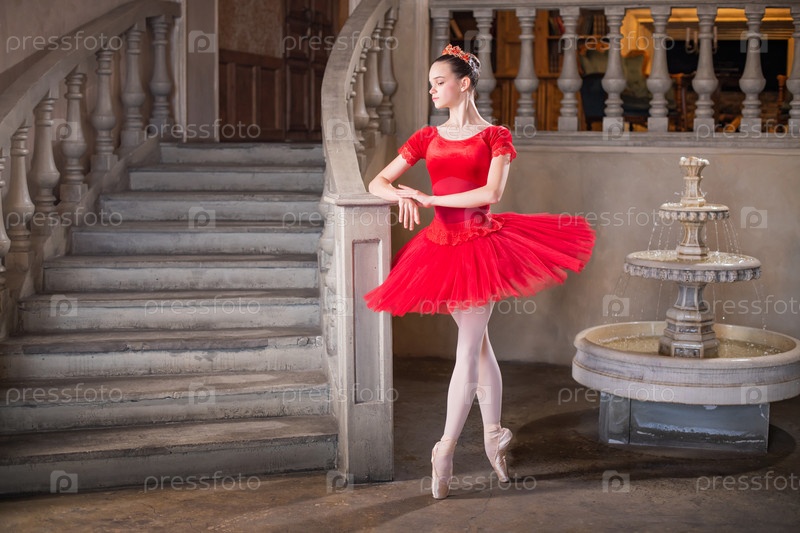 Юная балерина в красной пачке танцует на фоне театральных декораций дворца