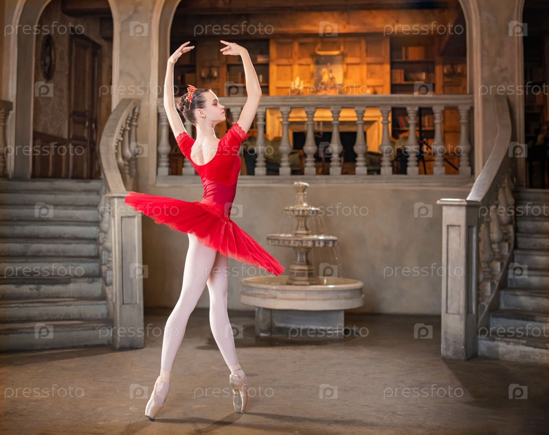 Юная балерина в красной пачке танцует на фоне театральных декораций дворца
