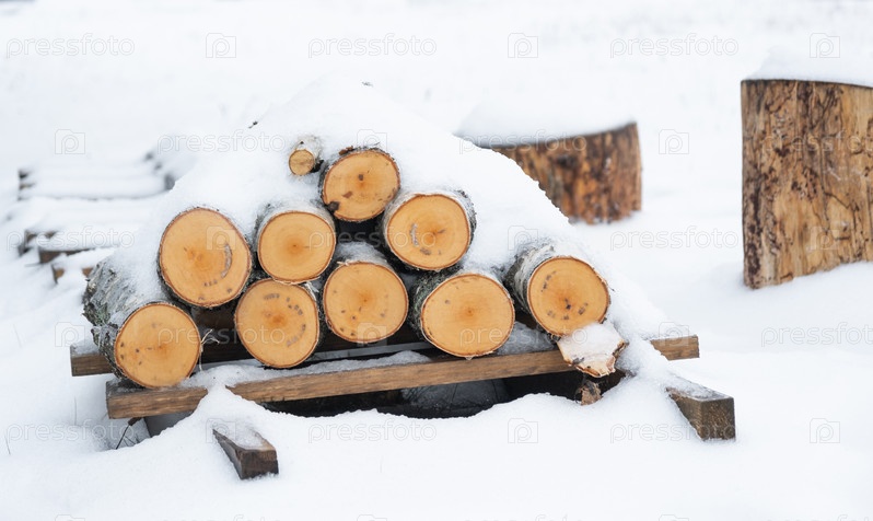 Стопка бревен для дров лежит под снегом. Альтернативное экологичное отопление зимой