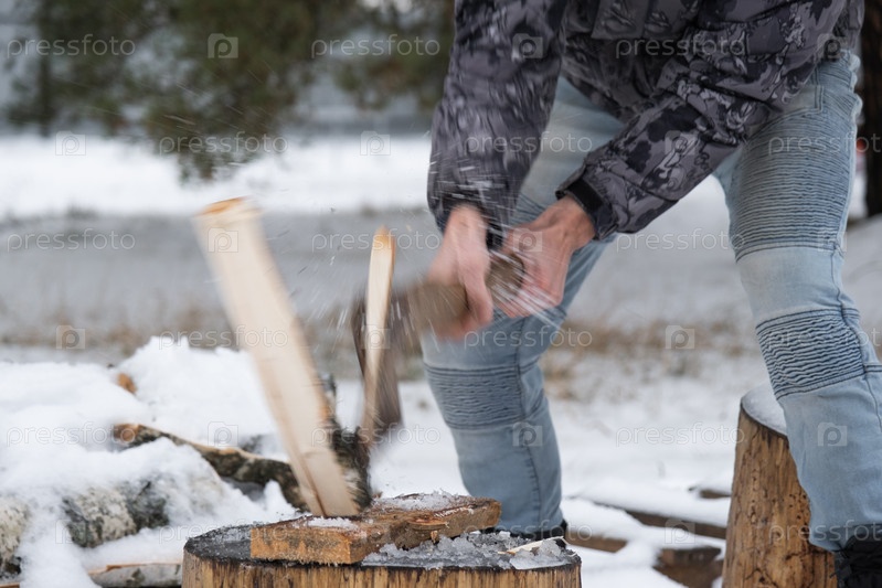 Мужчина рубит дрова топором зимой на открытом воздухе в снегу. Альтернативное отопление, заготовка древесины, энергетический кризис
