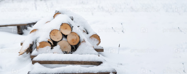 Стопка бревен для дров лежит под снегом. Альтернативное экологичное отопление зимой