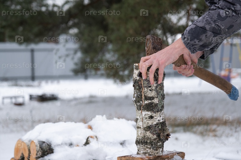 Мужчина рубит дрова топором зимой на открытом воздухе в снегу. Альтернативное отопление, заготовка древесины, энергетический кризис