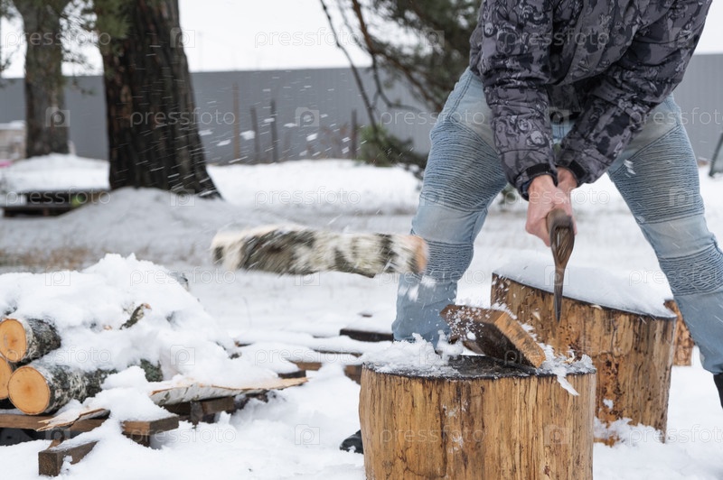 Мужчина рубит дрова топором зимой на открытом воздухе в снегу. Альтернативное отопление, заготовка древесины, энергетический кризис