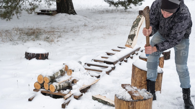 Мужчина рубит дрова топором зимой на открытом воздухе в снегу. Альтернативное отопление, заготовка древесины, энергетический кризис