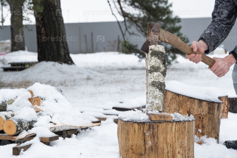 Мужчина рубит дрова топором зимой на открытом воздухе в снегу. Альтернативное отопление, заготовка древесины, энергетический кризис