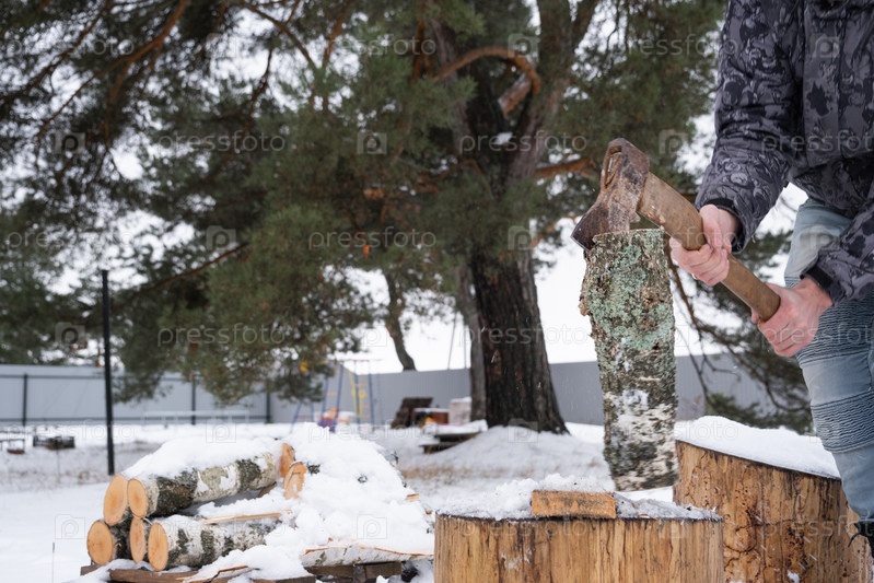 Мужчина рубит дрова топором зимой на открытом воздухе в снегу. Альтернативное отопление, заготовка древесины, энергетический кризис
