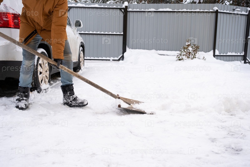 Мужчина зимой чистит снег лопатой во дворе дома на стоянке. Снегопад, сложные погодные условия, машина глохнет, перекапывает проезд