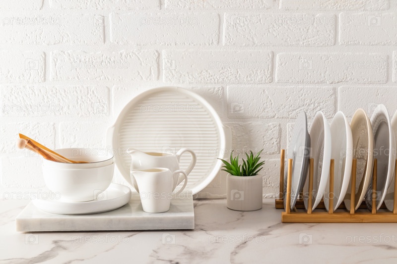 Набор кухонной утвари на белой мраморной столешнице, сушилка с тарелками на фоне белой кирпичной стены. экологически чистый дом