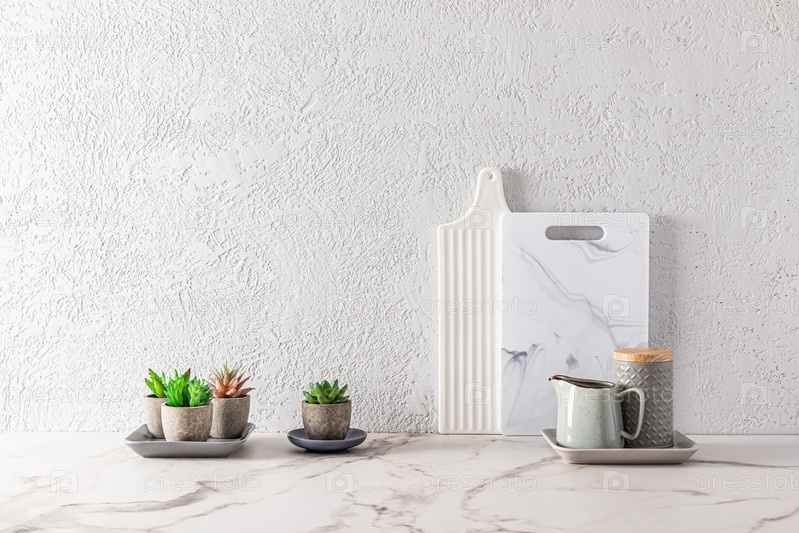 Часть интерьера современной кухонной столешницы с разделочными досками из белого мрамора и суккулентами в цветочных горшках. минимализм