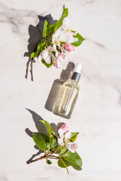 Флакон с косметикой или сывороткой для ухода за кожей лица на мраморно-белом фоне и веточки цветущей яблони. вид сверху