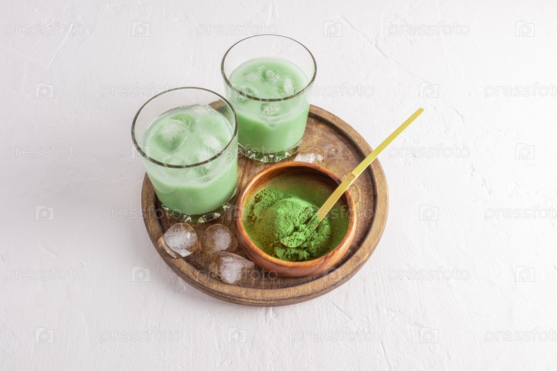 Два стакана чая маття латте с кубиками льда на деревянном подносе с миской порошка зеленого чая. оздоровительное бодрящее средство