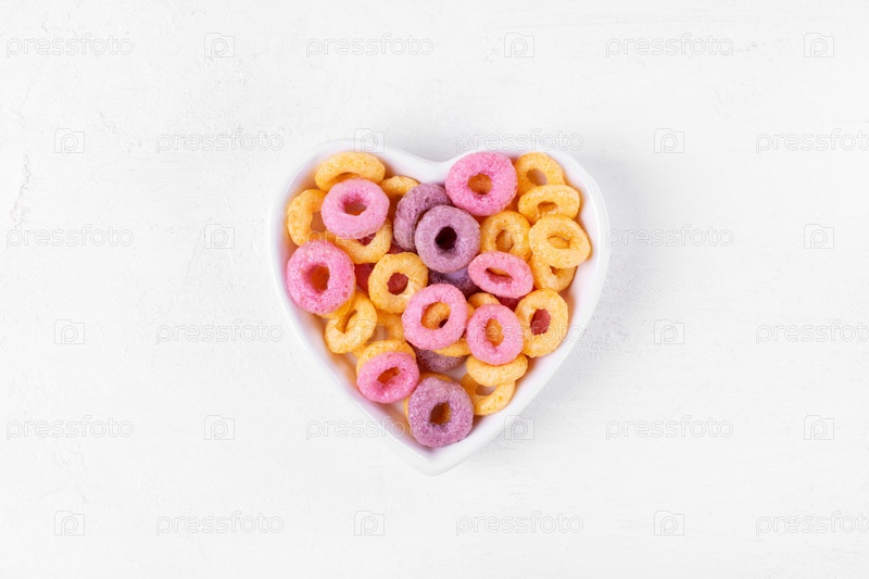 Разноцветные хлопья для завтрака в миске в форме сердца на белом столе